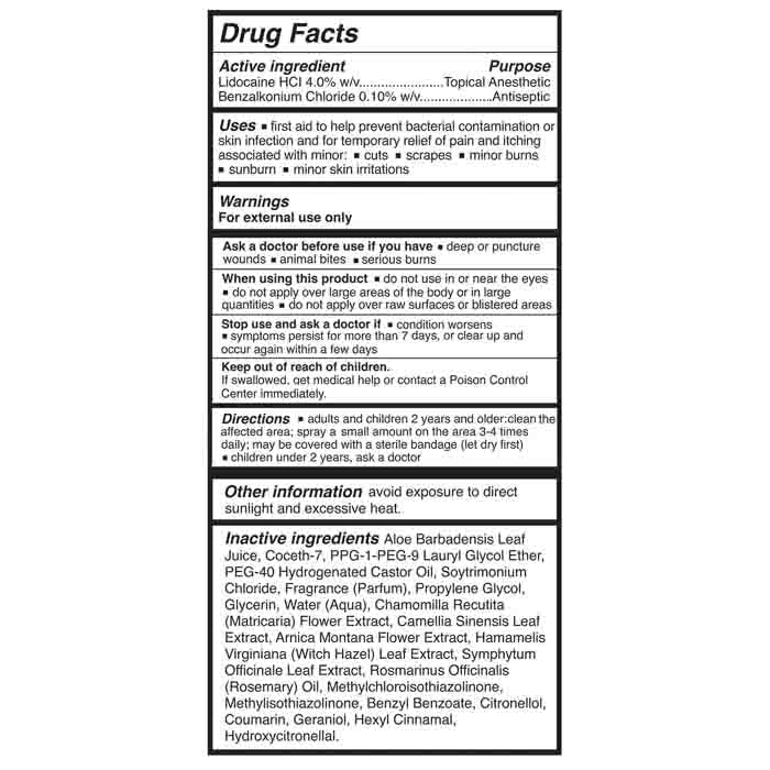 Inactive Ingredients: Aloe Barbadensis Leaf Juice, Coceth-7, PPG-1-PEG-9 Lauryl Glycol Ether, PEG-40 Hydrogenated Castor Oil, Soytrimonium Chloride, Fragrance (Parfum), Propylene Glycol, Glycerin, Water (Aqua), Chamomilla Recutita (Matricaria) Flower Extract, Camellia Sinensis Leaf Extract, Arnica Montana Flower Extract, Hamamelis Virginiana (Witch Hazel) Leaf Extract, Symphytum Officinale Leaf Extract, Rosmarinus Officinalis (Rosemary) Oil, Methylchloroisothiazolinone, Methylisothiazolinone, Benzyl Benzoate, Citronellol, Coumarin, Geraniol, Hexyl Cinnamal, Hydroxycitronellal